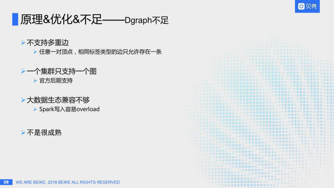 那Dgraph性能这么好,运维又简单,是不是就可以说Dgraph是一个完美的图数据库呢?是不是所有的场景都可以用Dgraph来支持呢?显然不是的,没有最完美的系统,只有最适合你业务的系统;就像没有最完美的人,只有最适合你的人一样。Dgraph也是有它的缺陷和不足的: