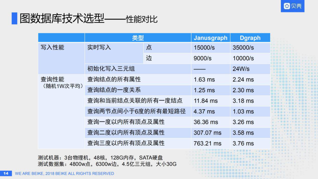 Dgraph只有一个可执行文件,通过指定不同的参数在不同的机器上启动,就能自动组成集群,无需搭建维护其他任何第三方系统,这是它的优势。那是不是就能通过这样的架构对比,因Dgraph运维简单就直接选择它呢?肯定不行,我们还需要做一些性能压测来对比,如果说JanusGraph的性能是Dgraph的好几倍,那维护成本高些也是可以接受的。所以基于这个目的,我们对这两个图数据库做了详细的性能对比测试。