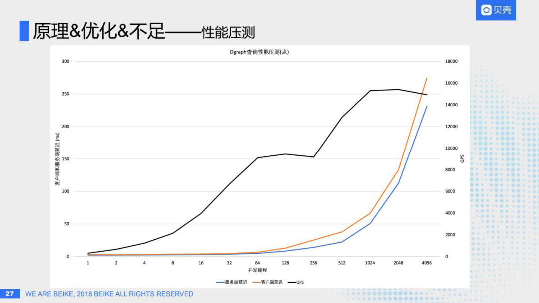 把这480亿数据导入后,就可以回答我们最初的问题了,它真的可以支持百亿级图谱数据毫秒级查询吗?于是我们专门对其进行了性能压测,如上图,可以看出Dgraph的性能确实很好,底下横坐标是我们的并发线程,左边纵坐标是响应时间 ( 单位毫秒 ),右边纵坐标是QPS吞吐率;当我们用1000并发压测时,仍然可以保持在50ms的响应延迟,并且QPS可以达到15000/s,性能非常好。