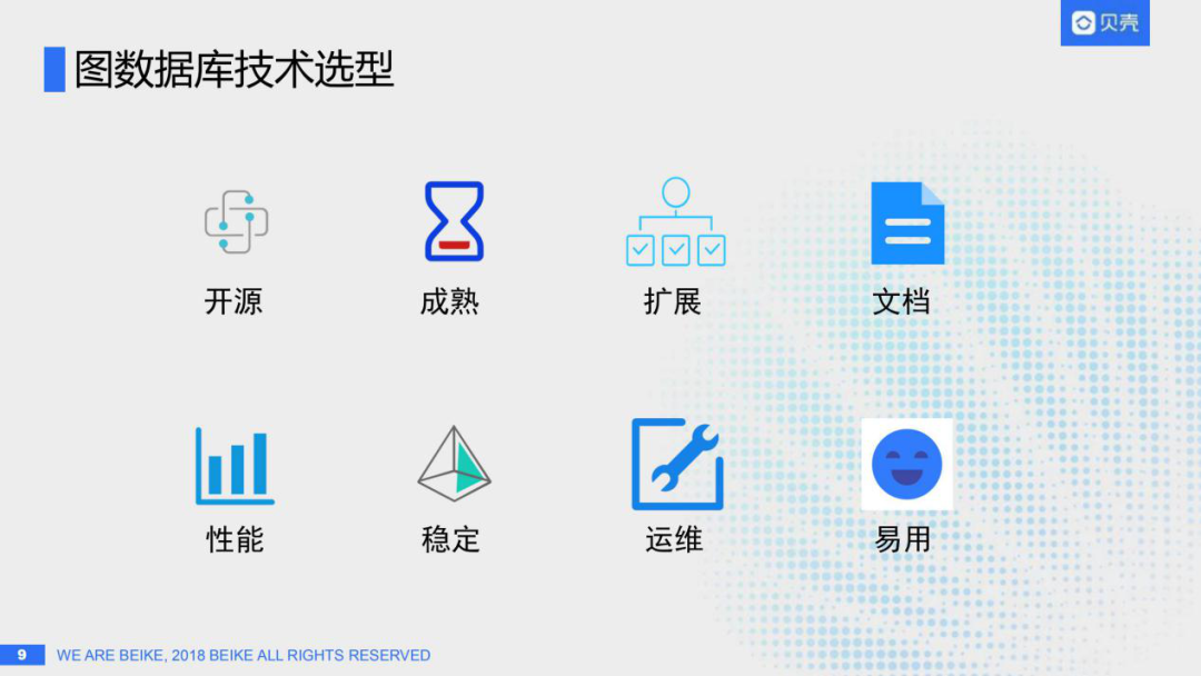 当我们进行图数据库技术选型的时候,我们具体需要关注哪些指标?哪些因素会影响我们的决策呢?我们主要关注以下几个方面:开源、成熟度、可扩展性、文档丰富度、性能、稳定性、运维成本、易用性。其中运维成本是比较容易忽视的,但我们做技术选型时必须考虑清楚,每种选型的运维成本是否是可接受的,投入产出比是否值得。
