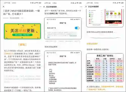 随后酷安KOL在个人微信公众号“关注米柚更新”上也公布了这个消息。并表示,通过此次对系统工具广告的整治,小米MIUI系统和国内其他几家热门厂商手机系统对比下,系统工具广告数量明显已经少于其余几家。对于此次小米的提升用户体验的态度,也给予肯定。
