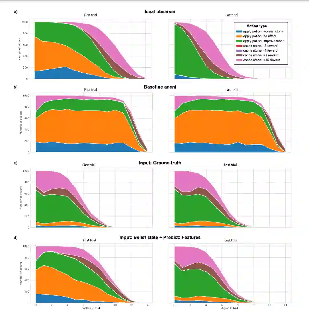 作为Alchemy的首次应用,作者将其介绍给了两种功能强大的深层RL智能体(IMPALA和V-MPO)。正如我们的论文中详细介绍的那样,尽管这些智能体在许多单任务RL环境中都表现良好,但在Alchemy中,它们都显示出非常差的元学习性能。即使经过大量的训练,两位特工的行为也仅反映了对任务的表面“理解”-本质上是将石头随机浸入药水中,直到碰巧产生了很高的石头价值。通过一系列详细的分析,我们能够确定元学习的失败不仅是由于3D环境的视觉运动挑战,也不是为了实现目标而对动作进行排序的难度。相反,智能体的糟糕表现特别反映了结构学习和潜伏状态推理的失败,这是元学习所涉及的核心功能。