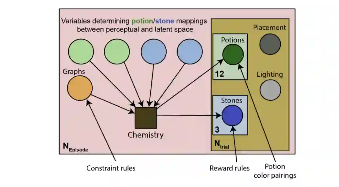 但是,Alchemy也涉及到一个至关重要的陷阱:每次玩游戏时,控制药水如何影响石头的“化学作用”都会改变。熟练的演奏者必须执行一组有针对性的实验,以发现当前化学反应的原理,并使用这些实验的结果来指导战略行动序列。在多轮Alchemy中学习如何做到这一点,正是meta-RL的挑战。