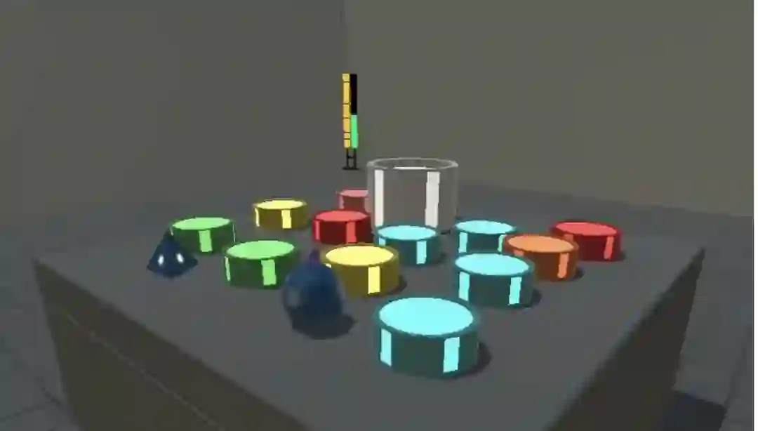 Alchemy是在Unity中实现的单人视频游戏。玩家可以看到桌子上的第一人称视角,桌子上有许多物体,包括一组彩色的石头,一组装有彩色药水的盘子和一个中央大锅。石头具有不同的点值,并且在将石头添加到大锅中时会收集点。通过将石头浸入魔药中,玩家可以改变石头的外观,从而改变它们的价值,从而增加可赢得的分数。