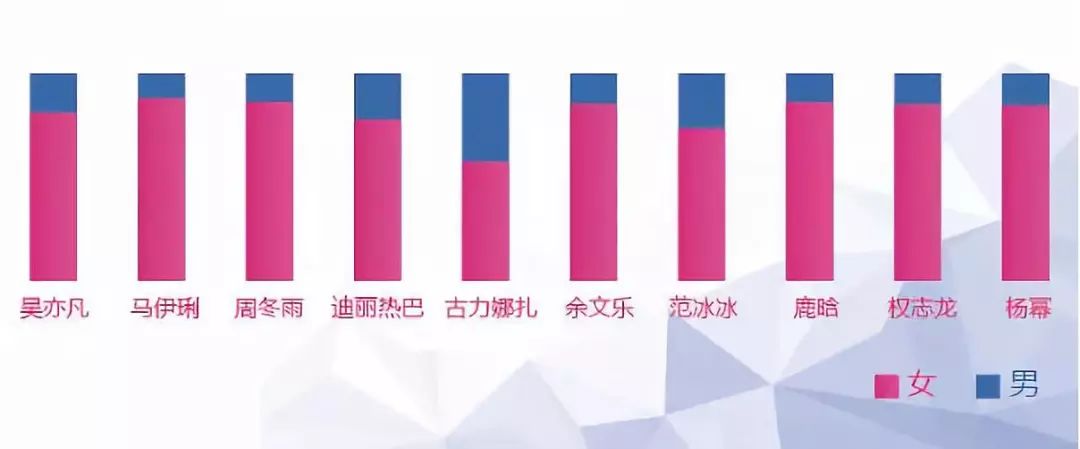 腾讯《流量明星受众分析报告》显示,杨颖有33%的男粉,迪丽热巴是53%,杨幂44%,郑爽39%,Tfboys是49%,李易峰51%,鹿晗54%,吴亦凡53%,杨洋45%,乍看男粉不少,但阿里的《明星消费影响力报告》正相反,除了男女通吃的古力娜扎,所有明星不管本身性别,带货靠的都是女友粉和亲妈粉。