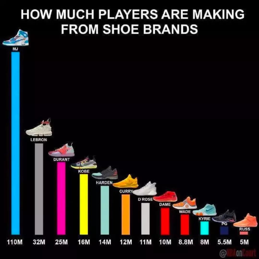 美媒分析了去年NBA球星的球鞋销售收入,发现乔丹、科比、韦德、詹姆斯和险些退役的德里克·罗斯等老牌球星全都在榜,冠军乔丹1.1亿美元是勒布朗·詹姆斯的3倍左右,杜兰特、哈登和库里三位当打球星分别只有2500万、1400万和1200万。