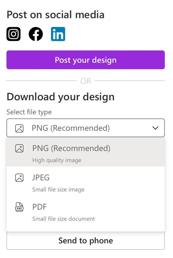 最后需要吐槽一点的就是,现有版本的 Microsoft Designer 导出选项只有三种:PNG、JPG 和 PDF —— 没错,它不支持 PPT 或 PSD 导出。这也就意味着,后续就别想着在 PPT 或 PhotoShop 进行修改了。也许后续微软会带来支持这两种文件导出的更新吧?