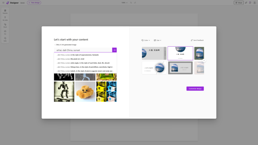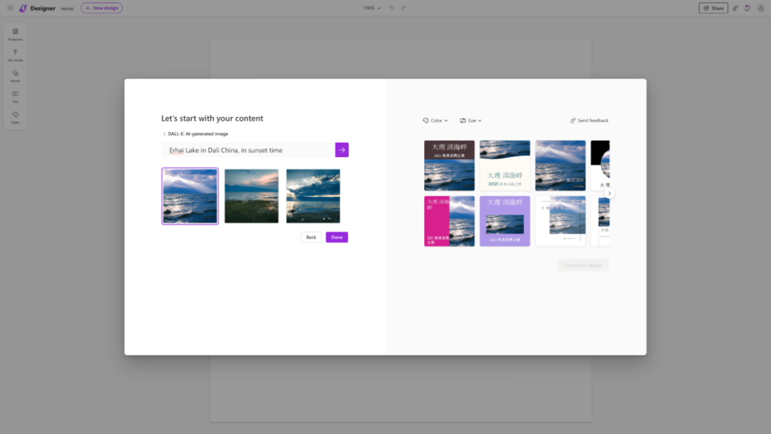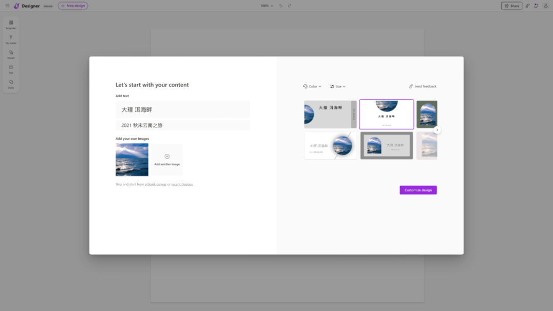 找到了心仪的图片之后,在右侧就能够看到 Microsoft Designer 为我们推荐的几个排版样式。在这里你还可以调节你想要的主题颜色和画面大小,然后在下面选择你喜欢的一款,点击「Customize design」就能进入到自定义设计界面了。