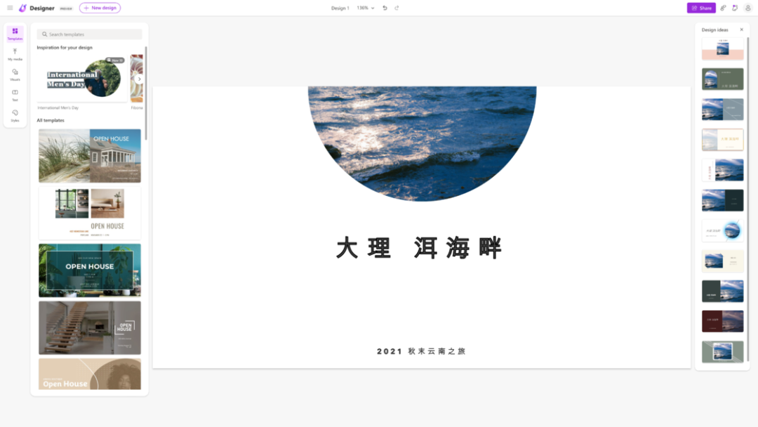 由于推出时间不久,Microsoft Designer 对中文的支持也不太友好,而 PPT 作为国民级工作软件之一,针对中文的适配已经相当成熟。还是以上面的洱海主题为例,在 Microsoft Designer 中,无论更换什么模板,文字基本都是相对现代风格的无衬线字体;而 PPT 则可以根据风格的不同,自动在衬线字体与非衬线字体中切换