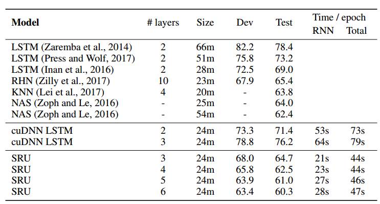事实上,使用 SRU 训练一个较深的网络十分简单,因为每一层都只需要较少的计算力,并有较高的处理速度。