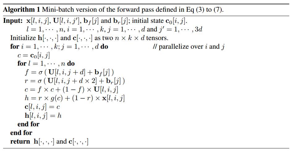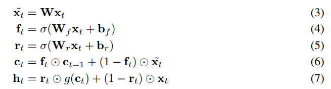 给定输入向量序列 {x_1, · · · , x_n},{x˜t,f_t, r_t} 对于不同的时间步 t=1,...,n 是独立的,因此可以并行计算所有这些向量。我们的方法和最近提出的 Quasi-RNN(Bradbury et al., 2017)十分相似。当我们在上方 3 到 5 表达式中的线性转换项 drop h_t-1 时,Quasi-RNN 使用 k-gram conv2d 运算来替代线性项。我们设计出的神经网络的瓶颈在于方程式 3 到 5 中间的三个矩阵乘法。在计算 x˜t、f_t 和 r_t 后,方程式 6 和 7 能够非常迅速和简洁的执行计算,因为它们的运算都是对应元素之间的操作。