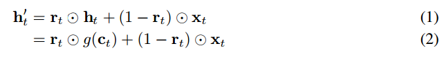 我们在实现中还是用了两个附加特征。首先我们在循环层之间添加了跳过连接,因为它们训练深度网络十分有效(He et al., 2016; Srivastava et al., 2015; Wu et al., 2016a)。具体来说,我们采用了高速连接(highway connection/Srivastava et al., 2015),此外输出状态 h_t'可以通过以下表达式计算:
