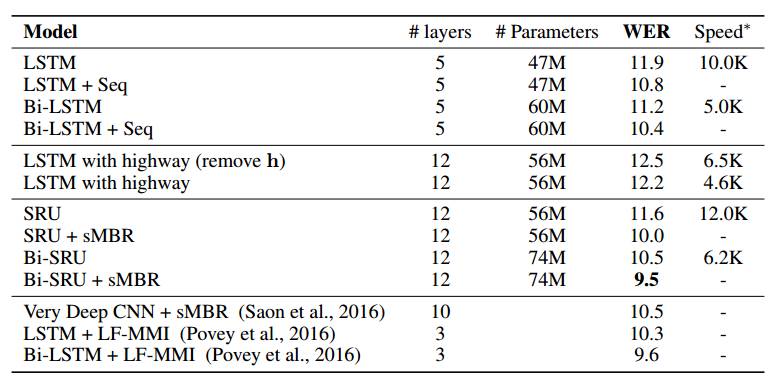 表 5:不同神经模型的词错率。注意这里报告的速度值是基于 SRU 在 CNTK 上的简单实现。没有表现出 CUDA 级别的最优化。