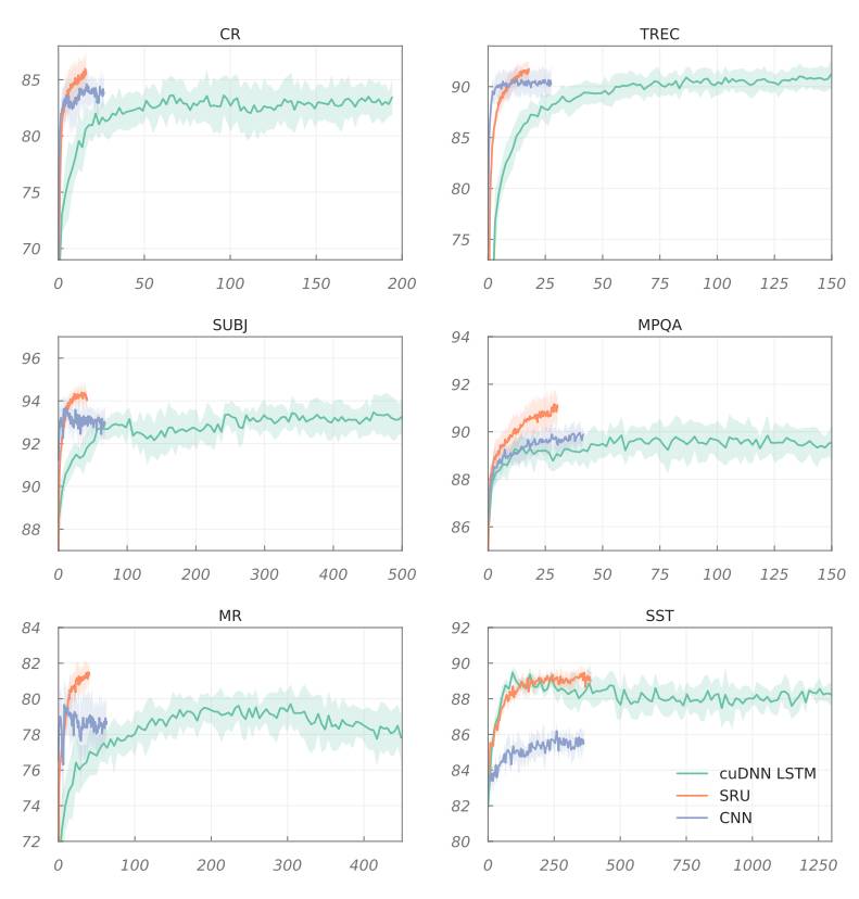 图 2:在 6 个分类基准上,LSTM、CNN 和 SRU 前 100 个 epoch 的平均有效准确率(y 轴)。X 轴:与第一次迭代关联的训练时间(秒)。时间测定是在 Pytorch 和桌面电脑上完成的,配有单个英伟达 GeForce GTX 1070 GPU、英特尔 Core i7-7700k 处理器、CUDA 8 和 cuDNN 6021。