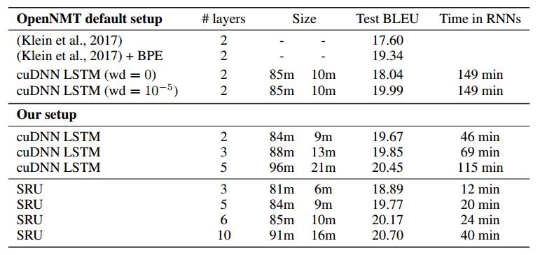 表 4:使用 OpenNMT 系统的英-德翻译结果,我们展示了参数的总数量与排除词嵌入之后的参数量。我们的设定对 ht_1 feeding 无效(即 -input_feed 0),极大的减少了训练时间。在解码器与编码器上每增加一个 LSTM 层,在一次训练 epoch 上就多花费 23 分钟,而 SRU 只花费 4 分钟。时间耗费测量是在单个英伟达 Titan X Pascal GPU 上完成的。