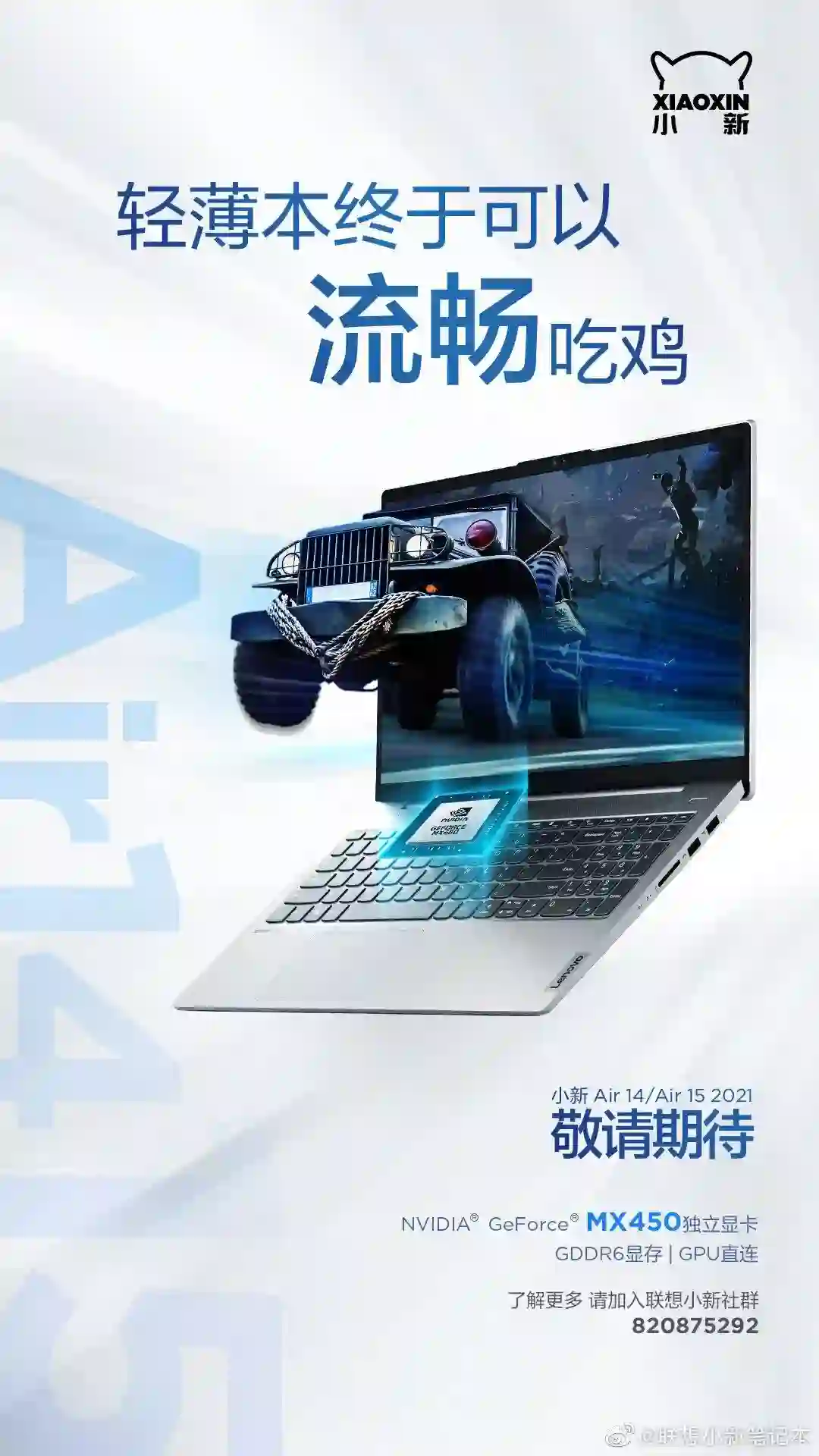 说完了更接近商务群体的几款轻薄本,接下来就轮到学生了,继小新Pro 13之后,联想又推出一款全新的小新Pro 14 2021 ,将小新Pro的产品线扩展到了最热门的14寸机型中。从配置表来看,这款小新Pro 14 2021 会用上英伟达最新的入门级独显MX450,用上了GDDR6的它在性能上已然接近了游戏本的级别。小新官方微博之前已经发布过相关的评测文章,称在“超大杯MX450”的加持下,轻薄本吃鸡并不再是梦想,而是“真正成为了现实”。