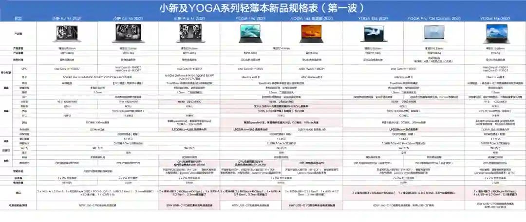 联想官方微博在昨天下午甚至提前放出了登场产品的配置表,从中我们也可以一窥这几款笔记本在硬件上的差异,尺寸从大到小排列,共分为8款,均为轻薄本,让我们来看看它们都有什么亮点吧。