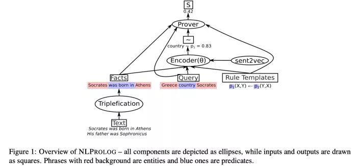 Weber等人[12]研究的是神经Prolog,这是一个可微逻辑方法(differentiable logic approach),它将符号推理和基于句子嵌入的规则学习方法结合了起来,可以字节应用到自然语言文本中,而不需要将文本转化为逻辑形式,且可以使用Prolog形式的推理来进行逻辑查询。因此,这个框架事实上是建立在模糊逻辑和预训练句子嵌入模型之上的。 我认为神经逻辑方法目前在社区中是一个被严重低估的领域,这篇文章以及上篇文章都为它们是如何推理出特定答案提供了一个非常基础的可解释的机制;因此当研究人员想要在真实可解释性方面开辟战场时,我希望这个领域能够得到足够的重视。图6:Taken from Weber et al. 针对处理起来相对简单的KGQA数据集,Xiong等人[13]提出了一种基于不完整知识图谱的QA,在这里需要进行一些链接预测;Sydorova等人[14]在TextKBQA任务(有两个知识源:图和文本段落)上获得了不错的结果。另外一种方法是Yang等人[15]提出的,他们使用了带有KG(本例中使用的是wordNet和NELL)的BERT形式的阅读理解模型。截止2019年3月,他们的KT-NET在SQuAD1.1和ReCoRD上的表现优于纯粹的MRC系统,这说明这是一个有前景的研究方法。 基于阅读理解的QA系统目前仍然是比较火热的领域,在本次会议中有多个oral和poster的session都是关于这一方面的,所以我敢肯定随后会有一些关于这个方面更详细的解读。。简而言之,类似WikiHop或HotpotQA这样的新数据集是针对整个 Wikipedia文章进行multi-hopQA,您需要结合几篇文章中方法来回答一个问题。CommensenseQA包含了从搜索引擎日志中获取的真实问题,因此系统需要建立莫衷类型的常识推理。如果你想从一堆完全无意义的样本中区分出有意义的部分,那么你就需要使用对抗训练了,今年ACL也提供了几篇文章(Zhu等人[16]和Wu等人[17]),他们的对抗训练还不错。 最后,要为了克服训练数据集较小的问题,Alberti等人[18]提供了一种改写数据增强方案(paraphrasing data augmentation schema),能够生成多达50M额外的问题来训练他们的系统,结果显示F1值有+2到+3的提升。