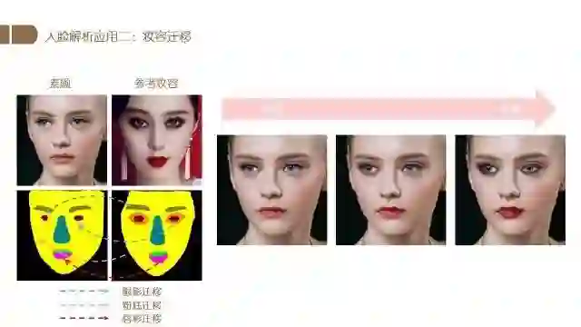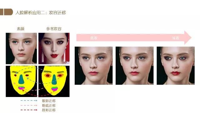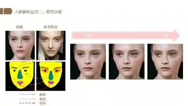 一些女生看到明星的照片时,常常会想看自己化上同样的妆是什么样子。为此我们设计了一个基于深度学习的妆容迁移算法。如下面两图所示。我们通过人脸解析算法得到妆容的关键区域,然后使用风格迁移的算法将不同区域的妆容转移至对应的区域。