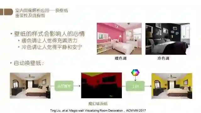根据分割的结果,我们就可以对壁纸进行颜色和纹理的更换。该工作发表于2017年的ACM Multimedia会议。下图是一些结果展示。