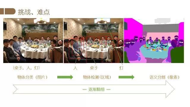 当我们想更进一步,对图片中的每个像素进行分类时,我们便进入了一个更加细致的领域,那就是像素级的语义分割,如下右图,每个像素都标上了对应的类别。可以看出,从物体分类到物体检测再到语义分割,任务的粒度越来越细。今天我所要介绍的主要内容便是三者中最为细致的语义分割。