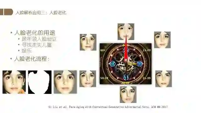 人脸老化对于跨年龄验证、走失人口寻找都有重要意义,而且具有一定的娱乐价值。在我们的工作中,先通过人脸解析提取人脸的主要部分,然后使用图片以及对应的年龄信息训练一个生成对抗网络(GAN)。在训练好模型后,将一个人的照片以及想转换到的年龄信息输入进这个模型,就可以得到相应年龄段的照片。该论文发表于ACM MM 2017。