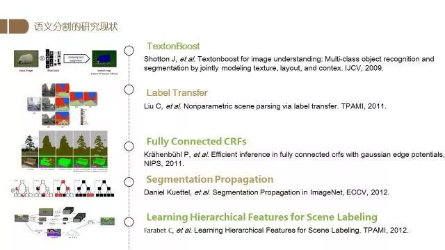 现在我们来介绍一下语义分割算法的前世今生。早期的算法中有参数型方法的代表Texton Boost,也有Label Transfer等非参的方法。2012年发表于TPAMI的Learning Hierarchical Features for Scene Labeling则是第一篇将深度学习应用于语义分割的算法。