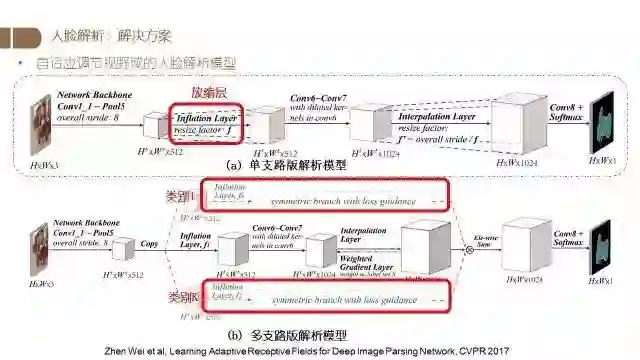 上图是我们课题组在CVPR2017所发表的一份工作。通过加入一个可学习的放缩层,可以让网络自动地去调节视野域以得到最好的分割结果。为此我们设计了两个不同版本的网络,其中单支路版本使用一个resize factor对特征进行变换,并使用变换后的特征进行前向计算,得到最终分割结果。