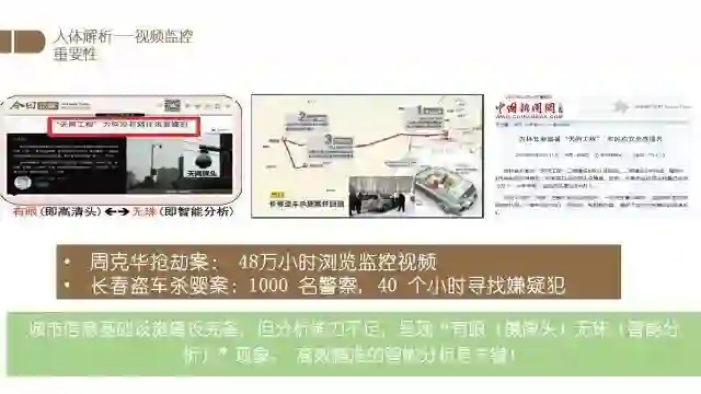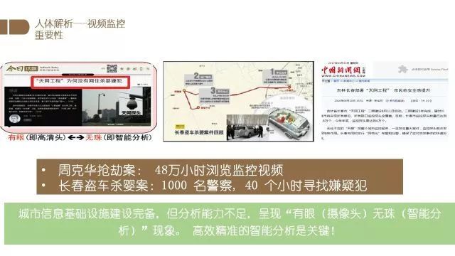 那么研究人体解析有什么样的重要性呢?举两个经典案例,在周克华抢劫案以及长春盗车杀婴案件中,虽然案发城市已经有完备的监控设备,但由于缺乏相应的分析能力,导致视频的筛选和分析仍需人力来进行,被人们形容为“有眼无珠”。如果能减少相应的人力消耗并提高分析速度,将会给社会带来很大的积极影响。