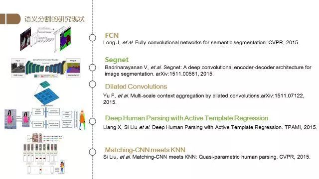 2015年梁小丹博士和我本人合作发表于TPAMI的Deep Human Parsing with Active Template Regression首次将语义分割应用于人像解析。我们的另一篇工作Matching-CNN meets KNN: Quasi-parametric human parsing则将KNN的方法与CNN进行结合,提升了网络对人体进行解析的能力。