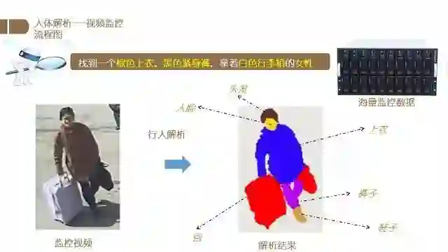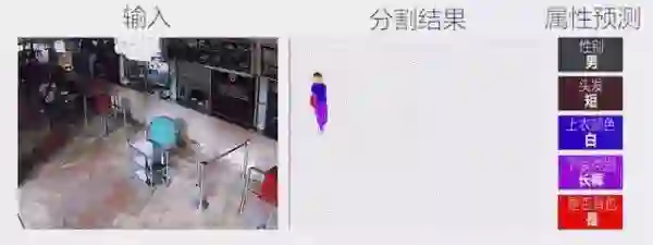如上图所示。设计好的分割模型可以准确地将人体图像进行分割,同时属性预测模型可以对人像进行准确的预测。这样一来,当我们拿到一个描述,例如图中“棕色上衣、黑色紧身裤,拿着白色行李箱的女性”时,计算机便可以快速地在海量监控数据中自动地找到匹配的图片或视频。