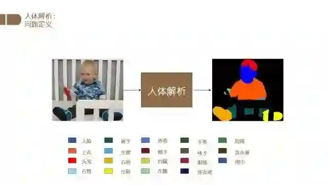 最后介绍一下人体解析的相关工作。与人脸解析部分相同,我们首先定义一下人体解析问题。对于一个给定的人物图片,人体解析的主要任务是将图片中人体的不同部位进行分类,最后获得像素级的分类结果。如上图所示。