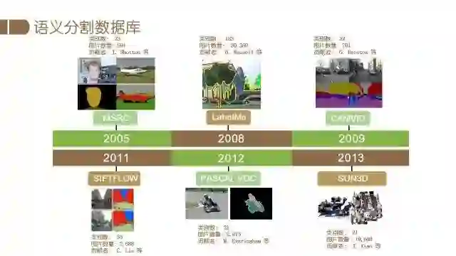 2011年的SIFTFLOW类别数为33类,含有2688张图片。2012年的PASCAL VOC含有21类物体以及2913张图片,该数据集后来成为了语义分割任务中一个重要的benchmark dataset。后来2014年在PASCAL VOC的基础上,PASCAL CONTEXT将物体类别以及图片数量都进行了大幅地扩充。
