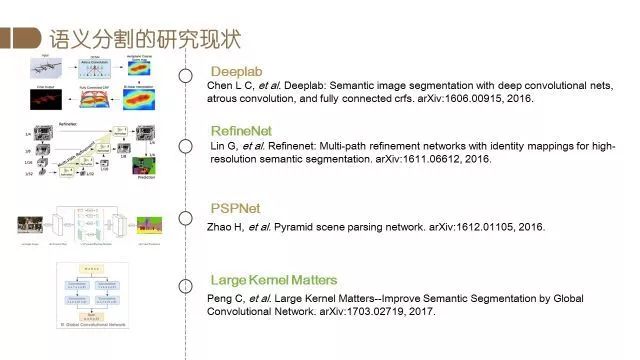之后Deeplab算法结合了dilated convolution以及fully connected crfs,提升了分割性能。RefineNet则提出了一种将高层语义特征以及底层特征进行融合的结构,极大地改进了性能。