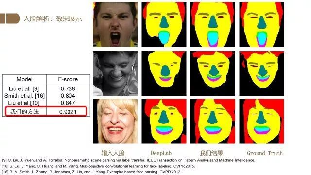 上图是我们的方法与其他人脸解析算法的定量及定性结果比对。可以看出我们的算法显著提升了解析的效果。仔细看图中右方的结果图,可以看出在嘴唇、眉毛、眼睛等部位的结果上,我们的方法结果更好。