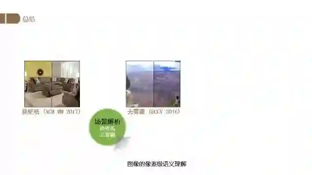 1、今天我首先分享了我们在场景解析方面的工作,主要是壁纸虚拟更换以及图片去雾霾工作(由于篇幅未展开)。