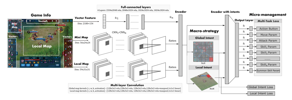 团队同时研发了监督学习(SL)方法,针对大局观和微操策略同时建模,让绝悟同时拥有优秀的长期规划和即时操作,达到了非职业玩家的顶尖水平。相关技术成果曾在2018年12月公开亮相对战人类玩家。其实,团队对于监督学习的研发一直在持续进行中。