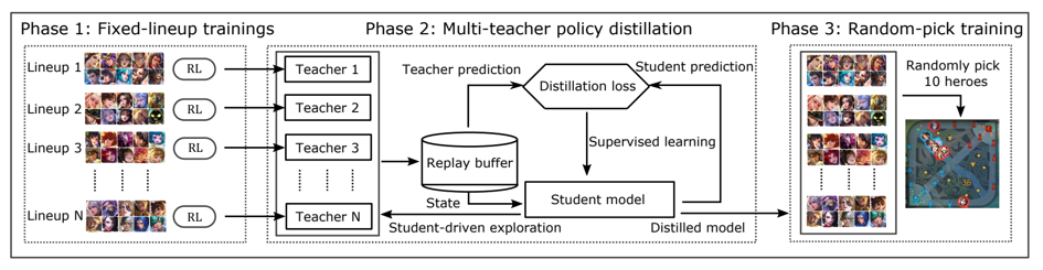 第一步是挑选多组覆盖全部英雄池的阵容,在小模型下用强化学习训练,得到多组“教师分身”模型;