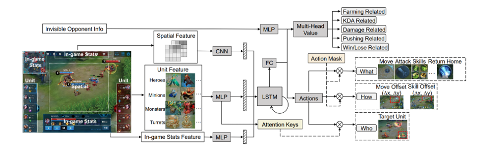 首先,团队构建了一个最佳神经网络模型,让模型适配MOBA类任务、表达能力强、还能对英雄操作精细建模。模型综合了大量AI方法的优势,具体而言,在时序信息上引入长短时记忆网络(LSTM)优化部分可观测问题,在图像信息上选择卷积神经网络(CNN)编码空间特征,用注意力(Attention)方法强化目标选择,用动作过滤(Action Mask)方法提升探索效率,用分层动作设计加快训练速度,用多头值估计(Multi-Head Value)方法降低估计方差等。