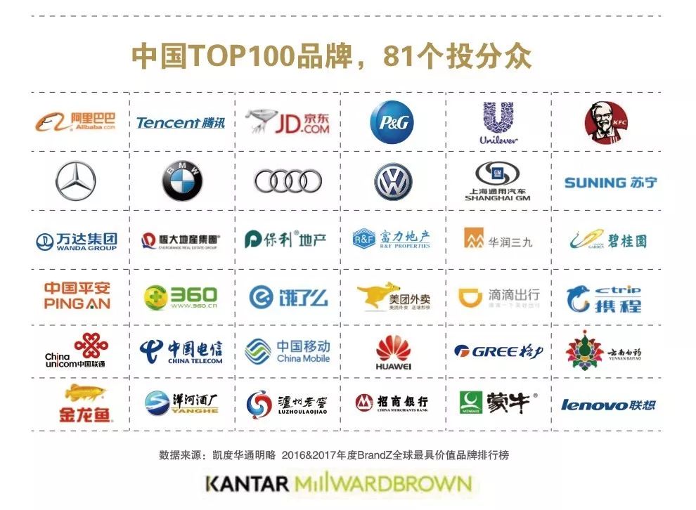每年,有 5400 多个品牌广告投放分众。根据 KANTAR MEDIA 的 BRANDZ TOP100 最具价值中国品牌 100 强榜,阿里、腾讯、京东、滴滴,宝洁,奔驰,蒙牛等中国 Top100 品牌中,有81 个选择分众媒体进行投放。有专家称,分众电梯媒体是“品牌打造的第一推动力”。