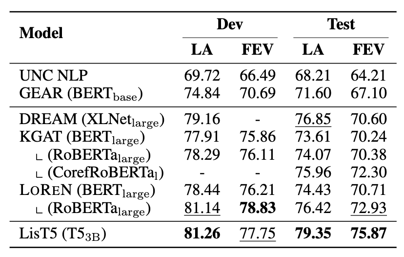 虽然 DREAM[3] 与 LOREN 在检索阶段采用了不同的策略,但是 LOREN 在最终指标上的提升也表明了该框架的优势。然而 LisT5[4] 因为其强大的预训练模型(T5-3B,十倍于RoBERTa-large),在测试集上的效果要明显优于其他模型。