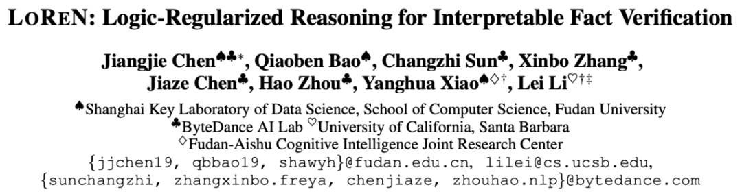 Jiangjie Chen, Qiaoben Bao, Changzhi Sun, Xinbo Zhang, Hao Zhou, Jiaze Chen, Yanghua Xiao, and Lei Li. "LOREN: Logic Enhanced Neural Reasoning for Fact Verification." AAAI 2022 (pre-print).