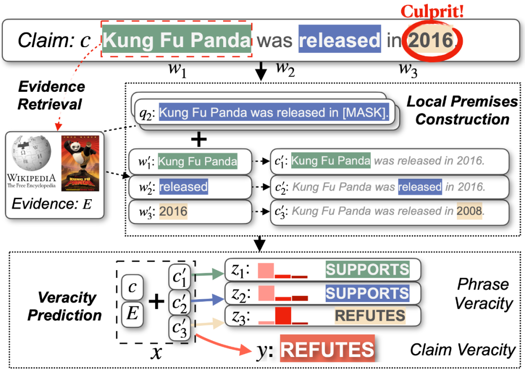 针对第二个问题,作者将其建模为一种阅读理解 (MRC) 任务。给定陈述和短语,首先对给定的短语构造引导问题,如「Kung Fu Panda was released in [MASK].」和「When was Kung Fu Panda released?」,并利用 MRC 模型从证据集中获取到对应的事实部分,如证据集中存在描述「Kung Fu Panda premiered in the United States on June 6, 2008.」,那么我们希望模型能够回答出「2008」。