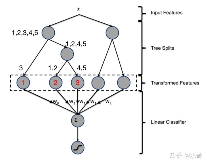 就是决策树,具体来说,Facebook的论文里面使用CART作为决策树。决策树的内容比较基础这里就不赘述了。但是它完成了两件事:(1)非线性的分类,(2)分桶。分桶的这个性质非常重要,属于是无心插柳式的点了。