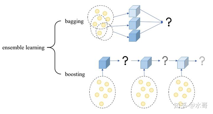 Boosting和树模型总是一起出现的,本质原因是树模型往往比较弱,而当我们不满足一个模型的能力,想要用多个模型来融合达到最佳结果,这种方法就是集成学习,即ensemble learning。而ensemble learning又可以分为两种:bagging和boosting,如下图所示: