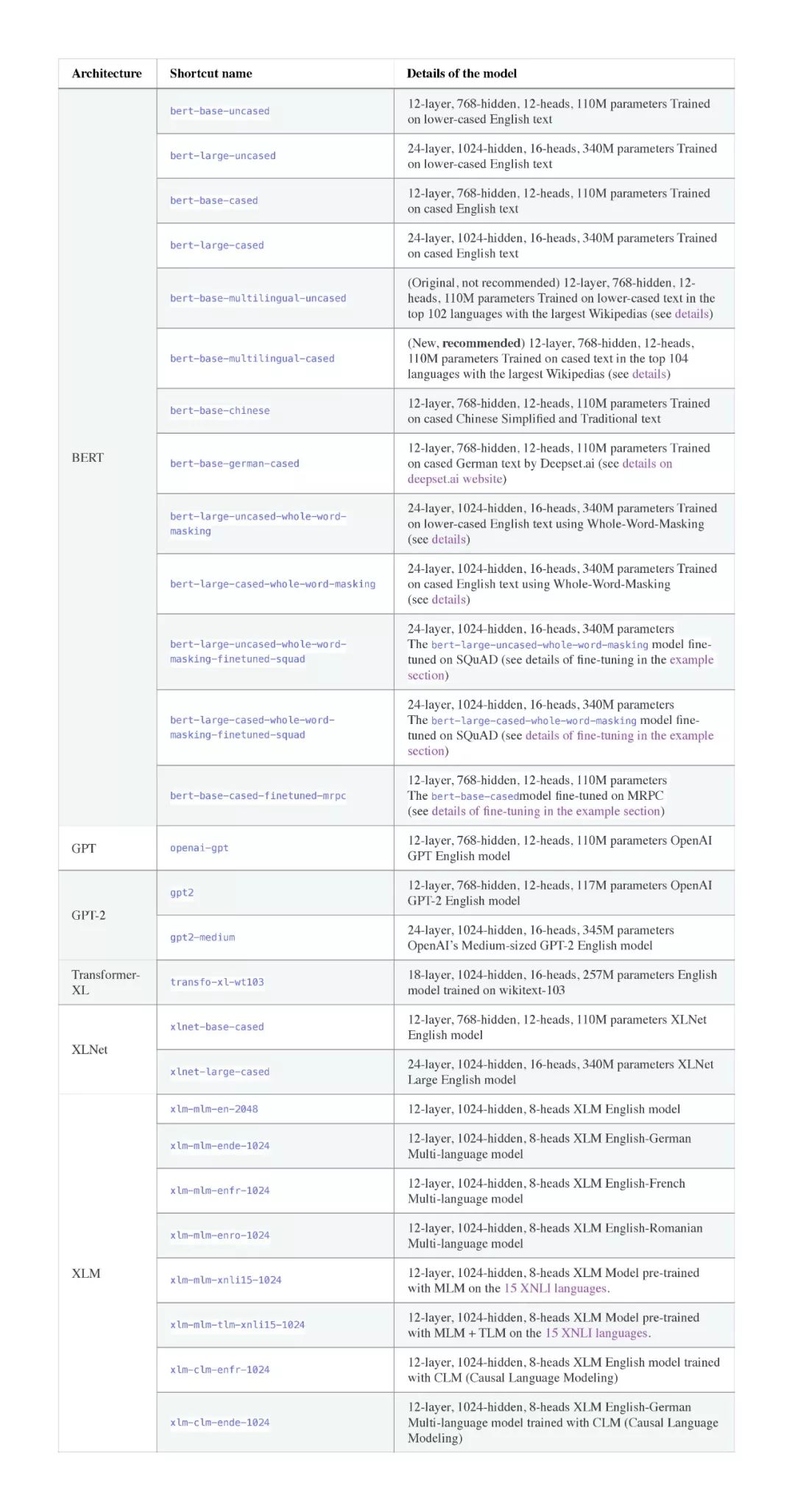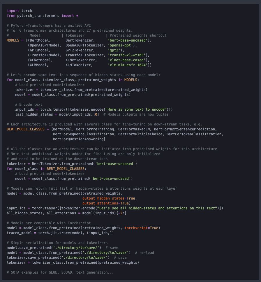 只需一个API,直接调用BERT, GPT, GPT-2, Transfo-XL, XLNet, XLM等6大框架,包含了27个预训练模型。