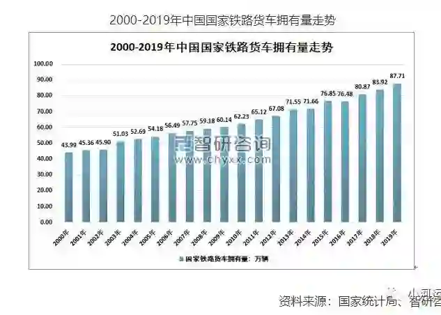 2000年中国国家铁路货车的拥有量为43.99万辆,2019年国家铁路货运车辆的拥有量较 2000 年增长 99.4%,达到了87.71万辆。