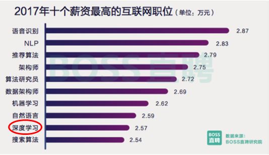 薪酬方面,1月10日下午BOSS直聘发布的《2017互联网人才趋势白皮书》显示,2017年互联网行业平均招聘薪酬达到1.06万元,同比上升3.1%。在薪资涨幅方面,新兴技术岗位排在前列,图像算法、推荐算法、深度学习等人工智能相关岗位薪资增幅均在15%以上。