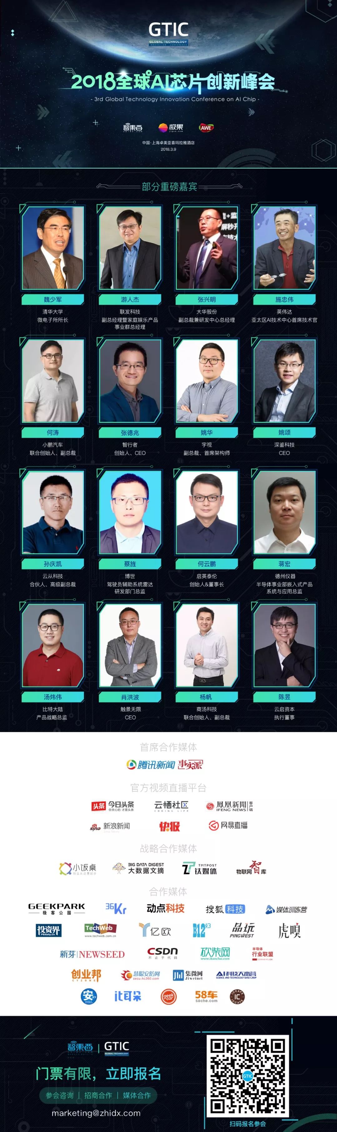 大会的报名相当火爆,目前投资人通道和创课用户通道已经陆续关闭。大家还可通过官网( http://gtic.zhidx.com/2018 )进行报名,或扫描下方海报上的二维码进入进行报名。