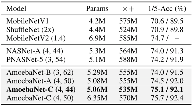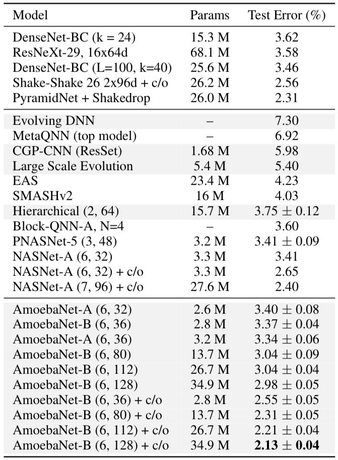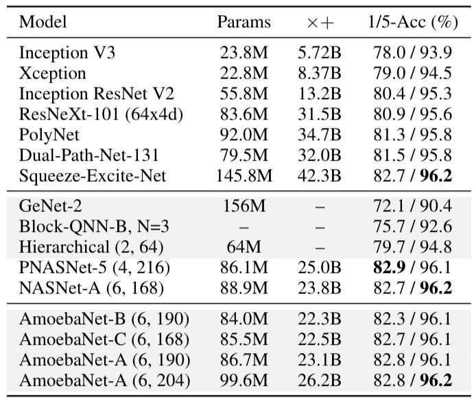 在相同的实验条件下,基线研究得到了NASNet-A。表2显示,在CIFAR-10数据集中,AmoebaNet-A在匹配参数时错误率较低,在匹配错误时,参数较少。同时在ImageNet上的表现也是目前最好的。